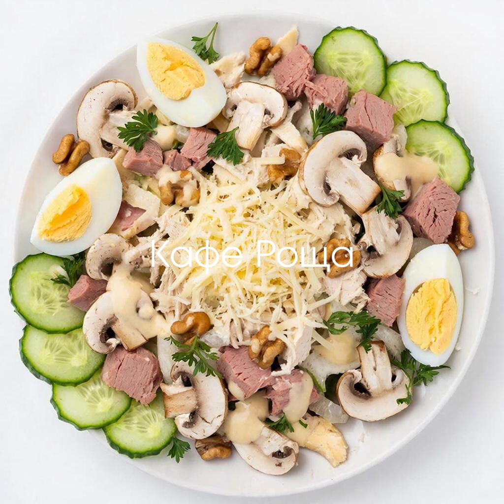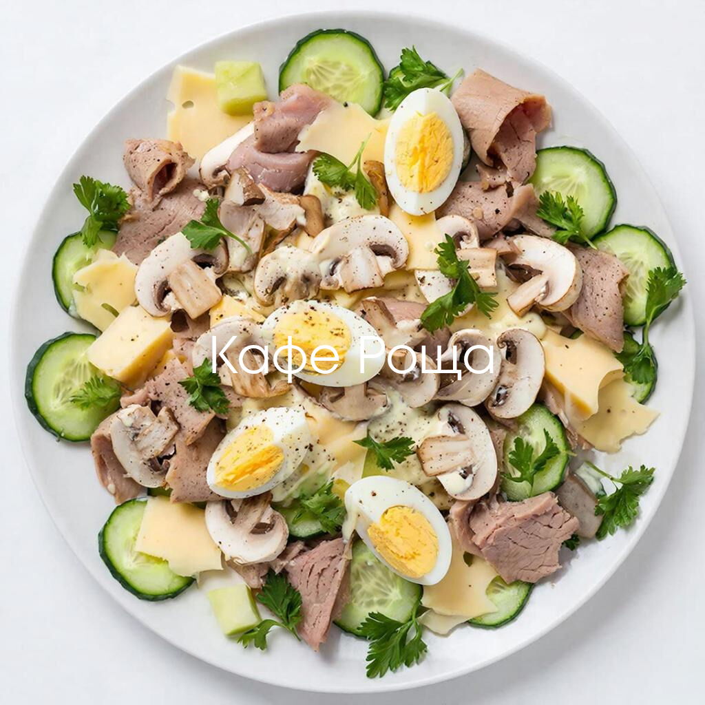 язык говяжий, огурцы свежие, сыр, шампиньоны, яйцо перепелиное, майонез, зелень