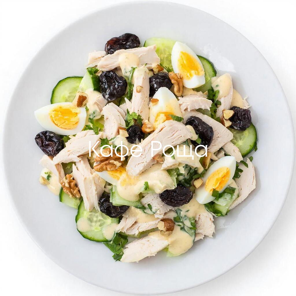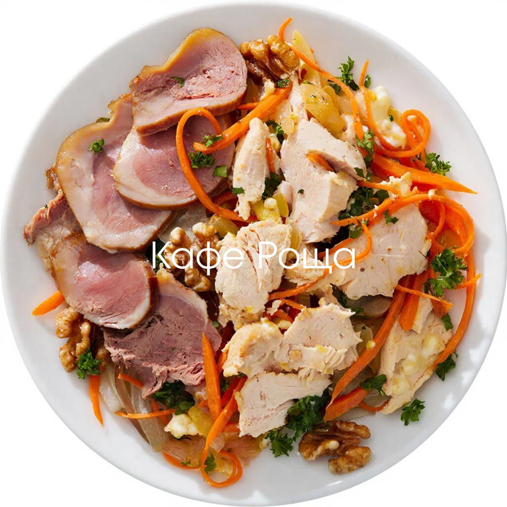 язык отварной, говядина отварная, куриное филе, морковь по-корейски, майонез, грецкий орех, зелень
