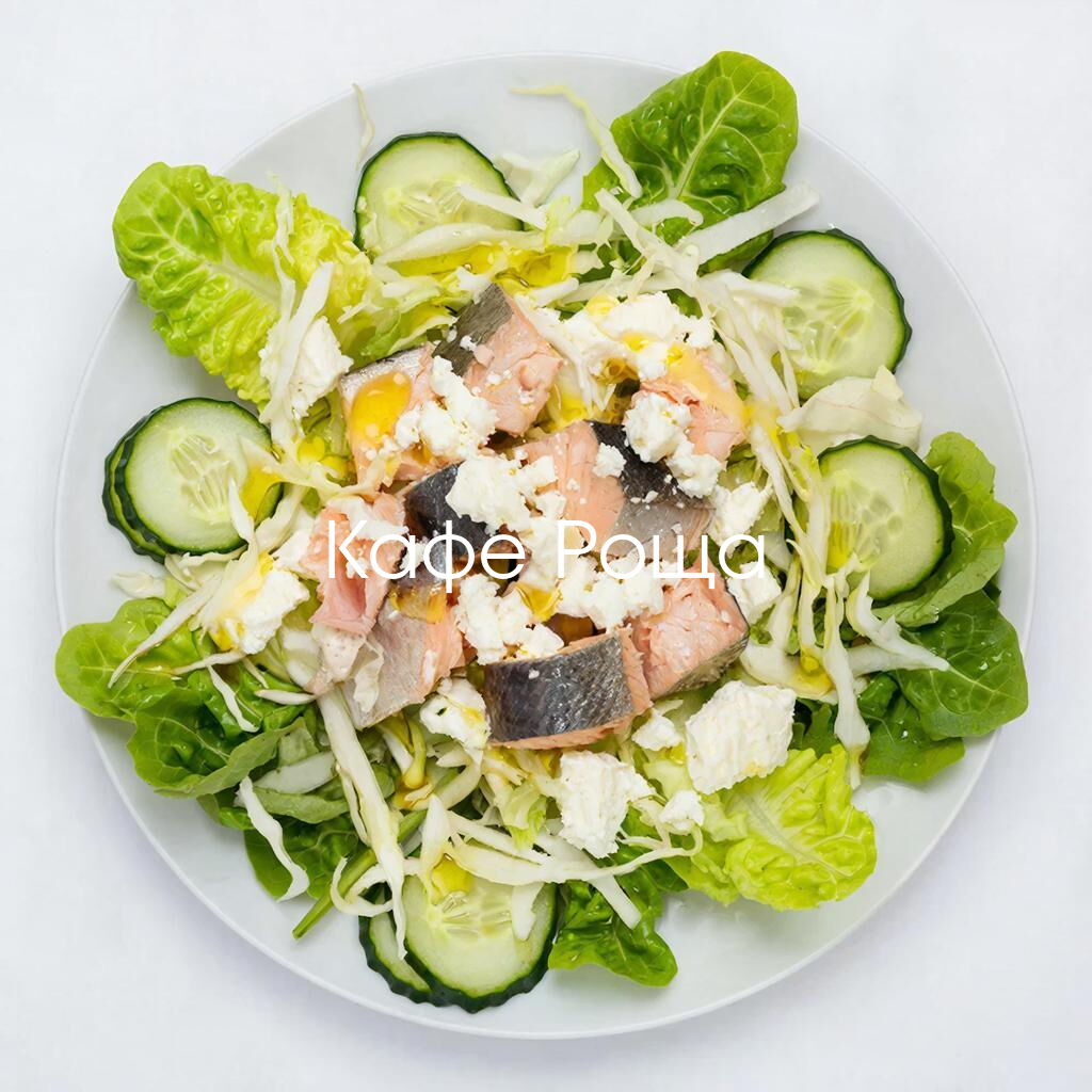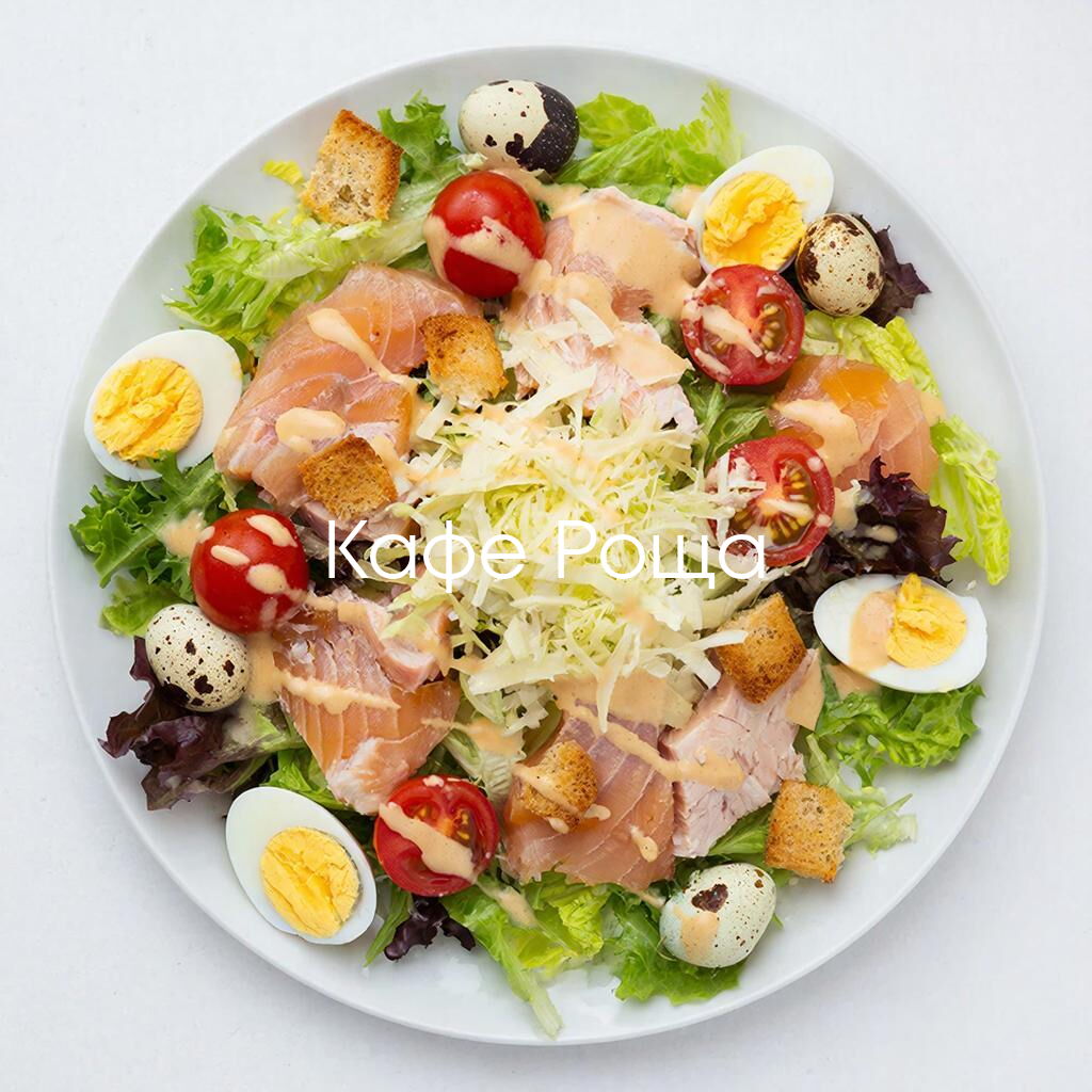 семга, помидоры Черри, яйцо перепелиное, пекинская капуста, сыр Пармезан, лист салата, гренки, соус Цезарь