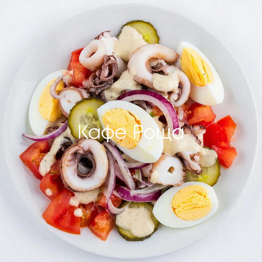 кальмар отварной, яйцо, лук, помидор, огурец маринованный, майонез