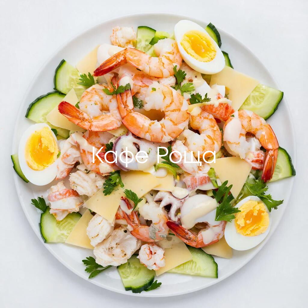 креветки, кальмары, крабовое мясо, сыр, яйцо, огурец свежий, майонез, зелень