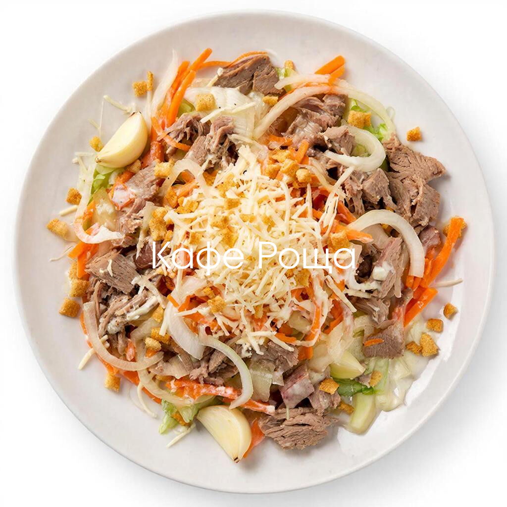 говядина отварная, лук, морковь по-корейски, сыр, чеснок, майонез, сухарики