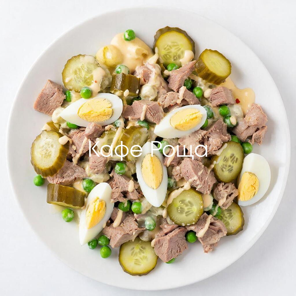 говядина отварная, огурец маринованный, яйцо, зеленый горошек, майонез