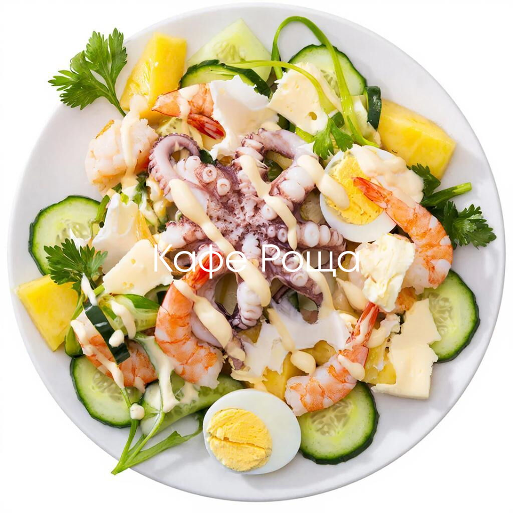 кальмар отварной, ананас консервированный, огурцы свежие, сыр, креветки, яйцо, майонез, зелень