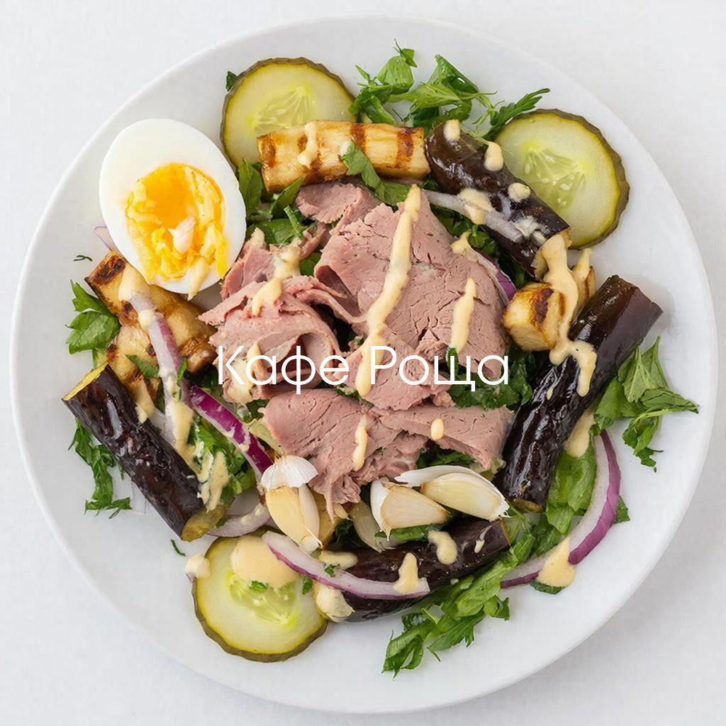 язык отварной, огурец соленный, баклажан обжаренный, яйцо, лук, зелень, чеснок, майонез