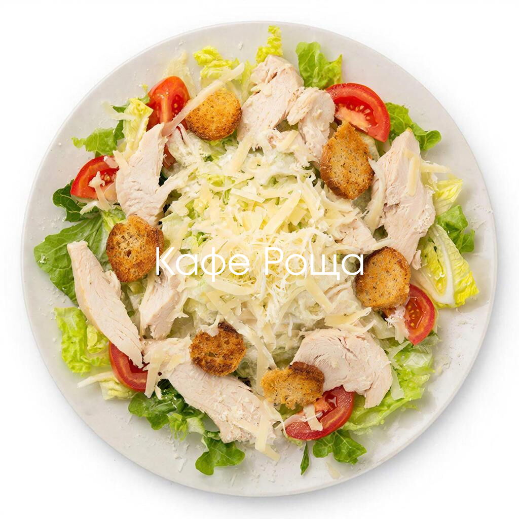 куриное филе, гренки, лист салата, пекинская капуста, свежие помидоры, сыр Пармезан, соус Цезарь