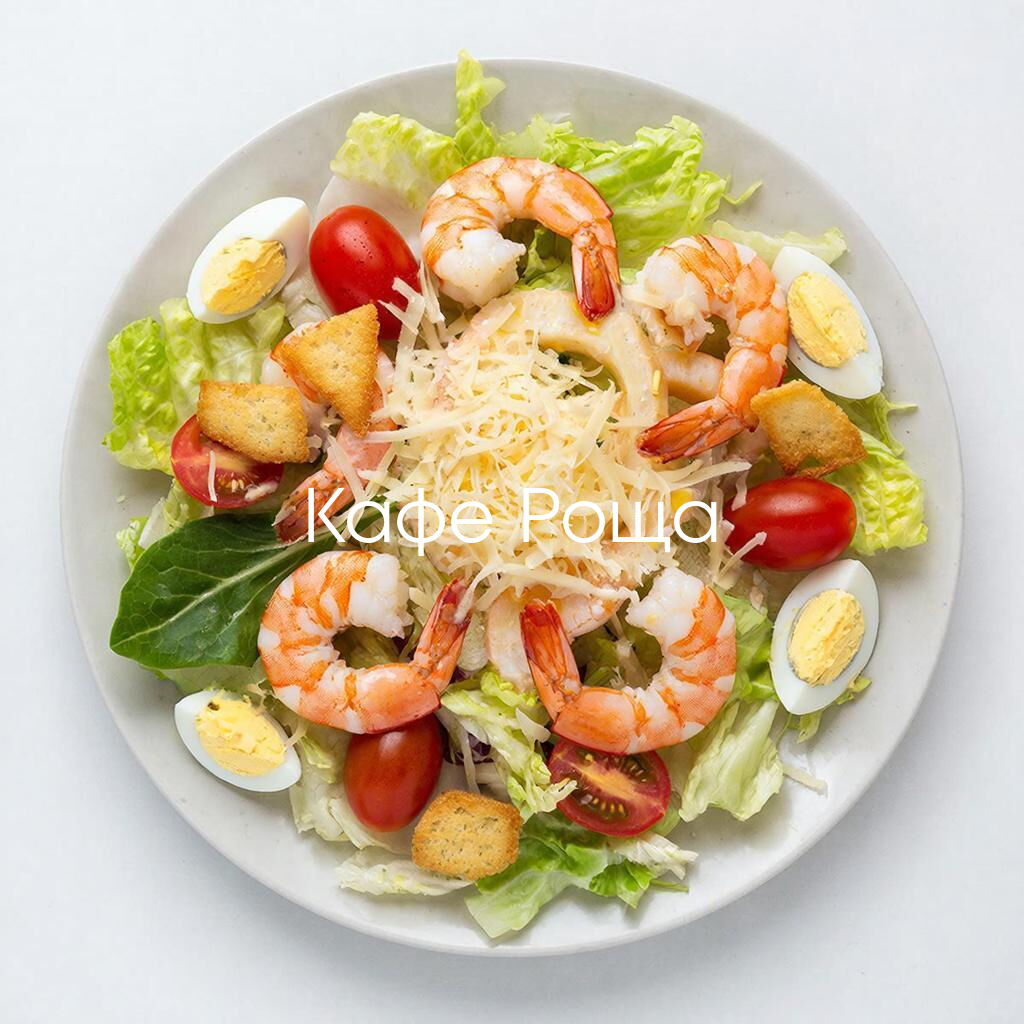 креветки, помидоры Черри, яйцо перепелиное, пекинская капуста, сыр Пармезан, лист салата, гренки, соус Цезарь